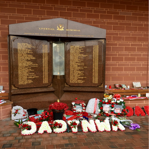 It's a picture of the Hillsborough memorial which stands in front of the Anfield stadium. We saw it on friday just before visiting the famous sport monument. This memorial was built in honour of the victims of the accident of 1985, when a grandstand broke down. We can see flowers and portraits on it, forming acronyms like «DYNWA» which means «Dad, You'll Never Walk Alone» in reference to the official song of the club which is a symbol of hope and solidarity. This moment was moving and it showed to the group that the liverpool football team had a whole history known and respected by all the locals even if they are not into football culture. This event is significant for people in liverpool to the point that football is now central to their culture.