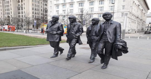 This is a statue of all the Beatles together in the street near the British music experience museum. We can recognize from left to right George Harrison, John Lennon, Ringo Starr and Paul Mccartney.